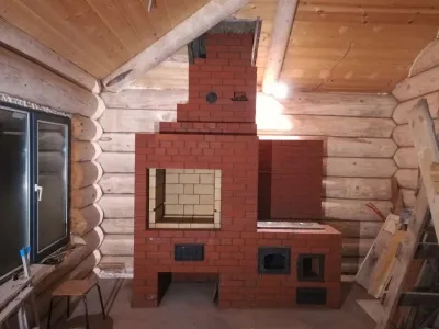Казан имеет правостороннее положение. Дополнительная перегородка защищает деревянную стену здания от теплового воздействия плиты. Дымоход спрятан в утолщенной стенке мангала.