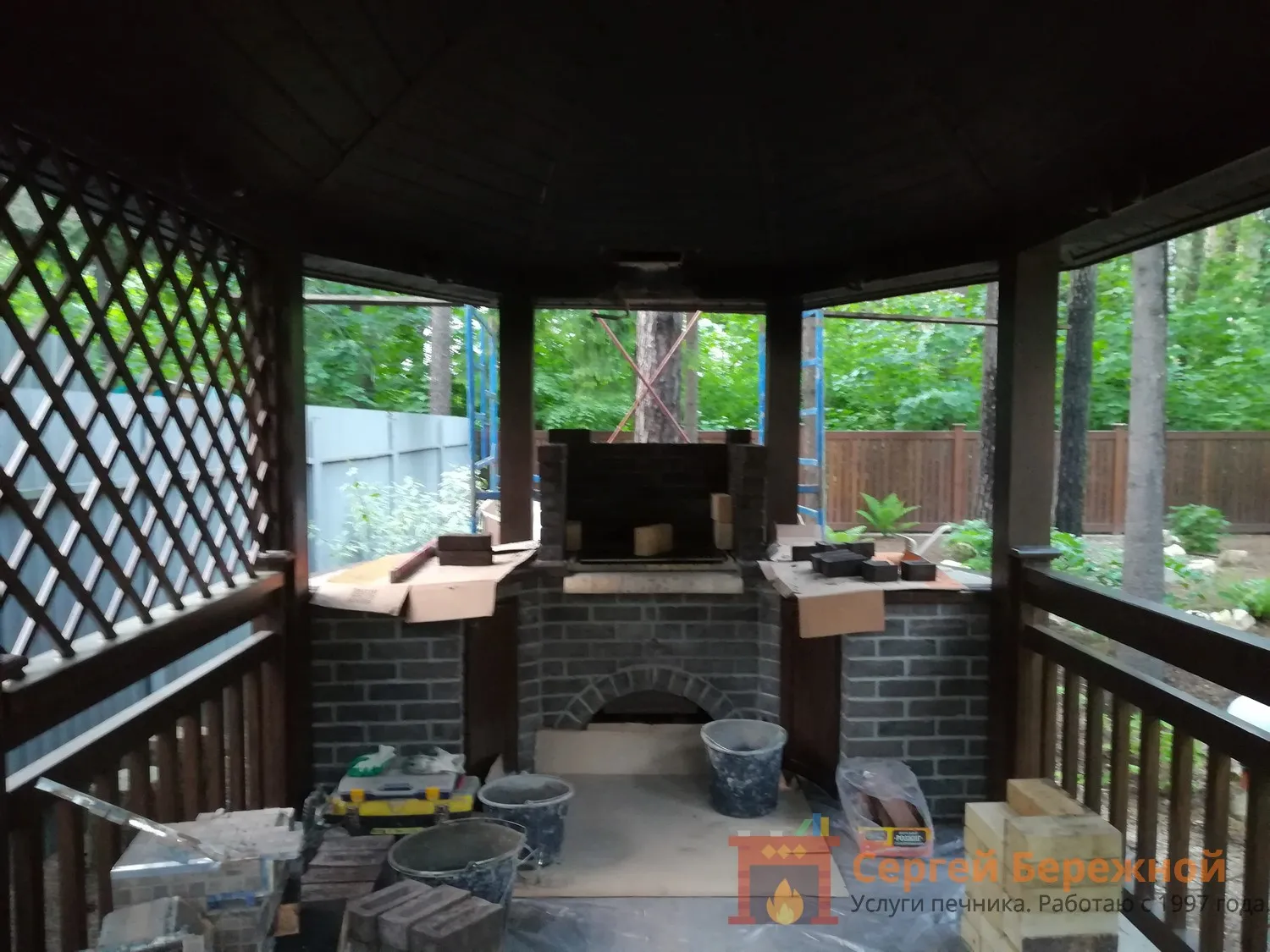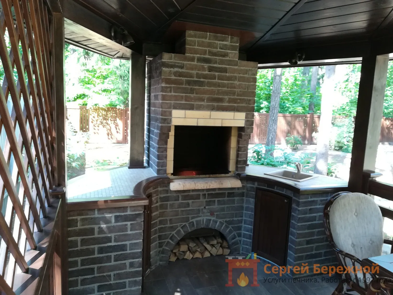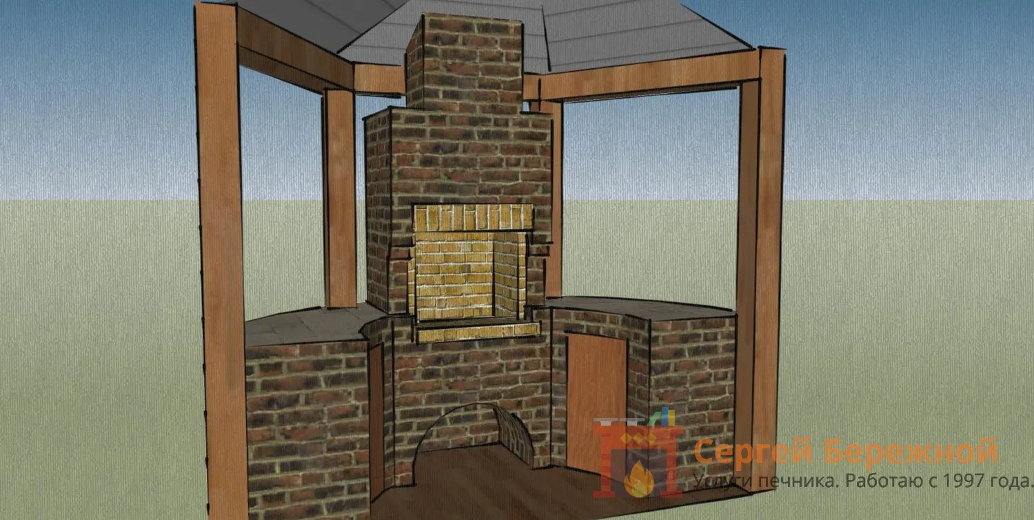 Применен лицевой застаренный кирпич размером 65*110*230 мм. Топливник обложен огнеупорным кирпичом.