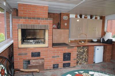Хозяева участка долгое время эксплуатировали конструкцию, выложенную каменщиками при строительстве беседки. Дым шел в помещение, но они предпочитали его не замечать. Меня им порекомендовал коллега с работы. Ремонтировать смысла не было, к тому же заказчики хотели еще и казан. Учитывая отведенные размеры под барбекю, сочетание элементов и рамки бюджета – проект ограничился одним вариантом.