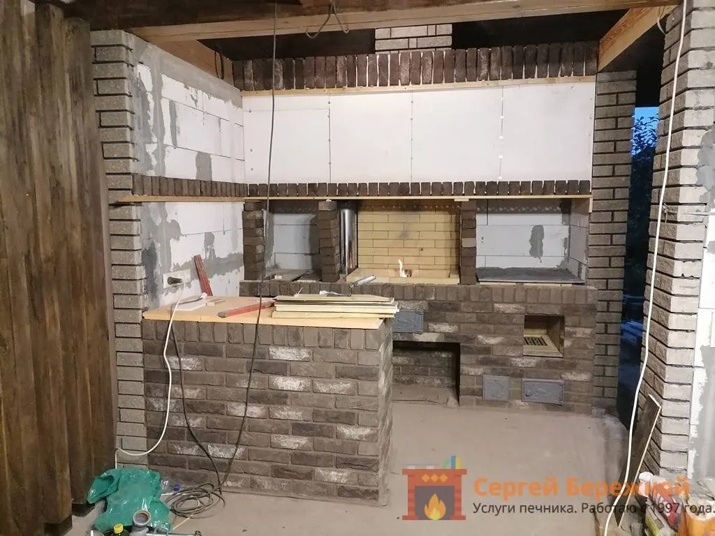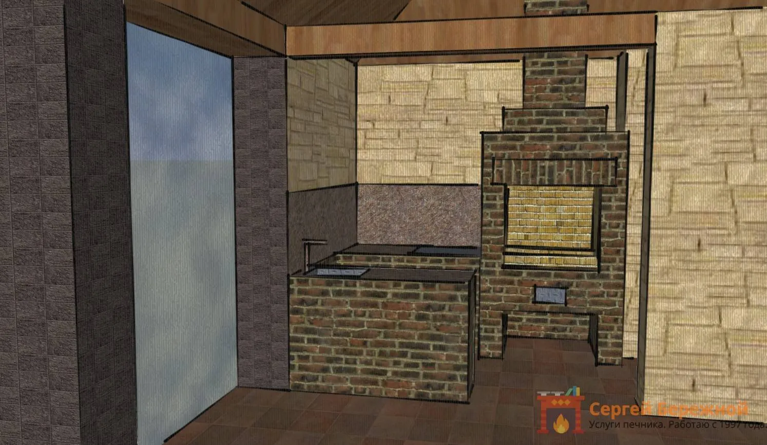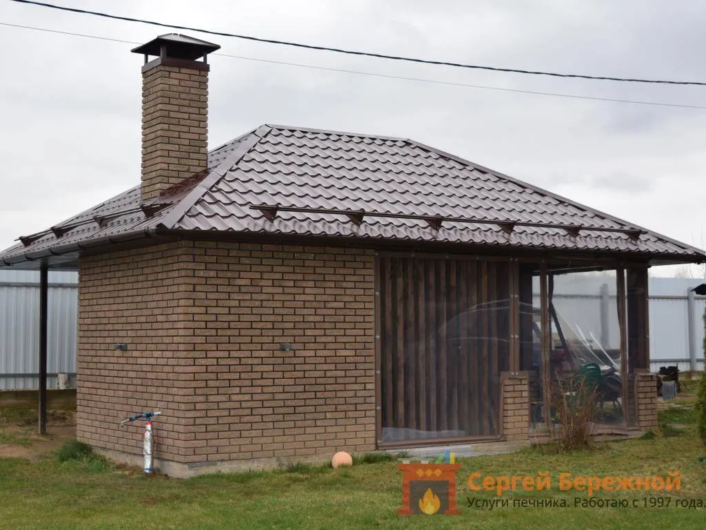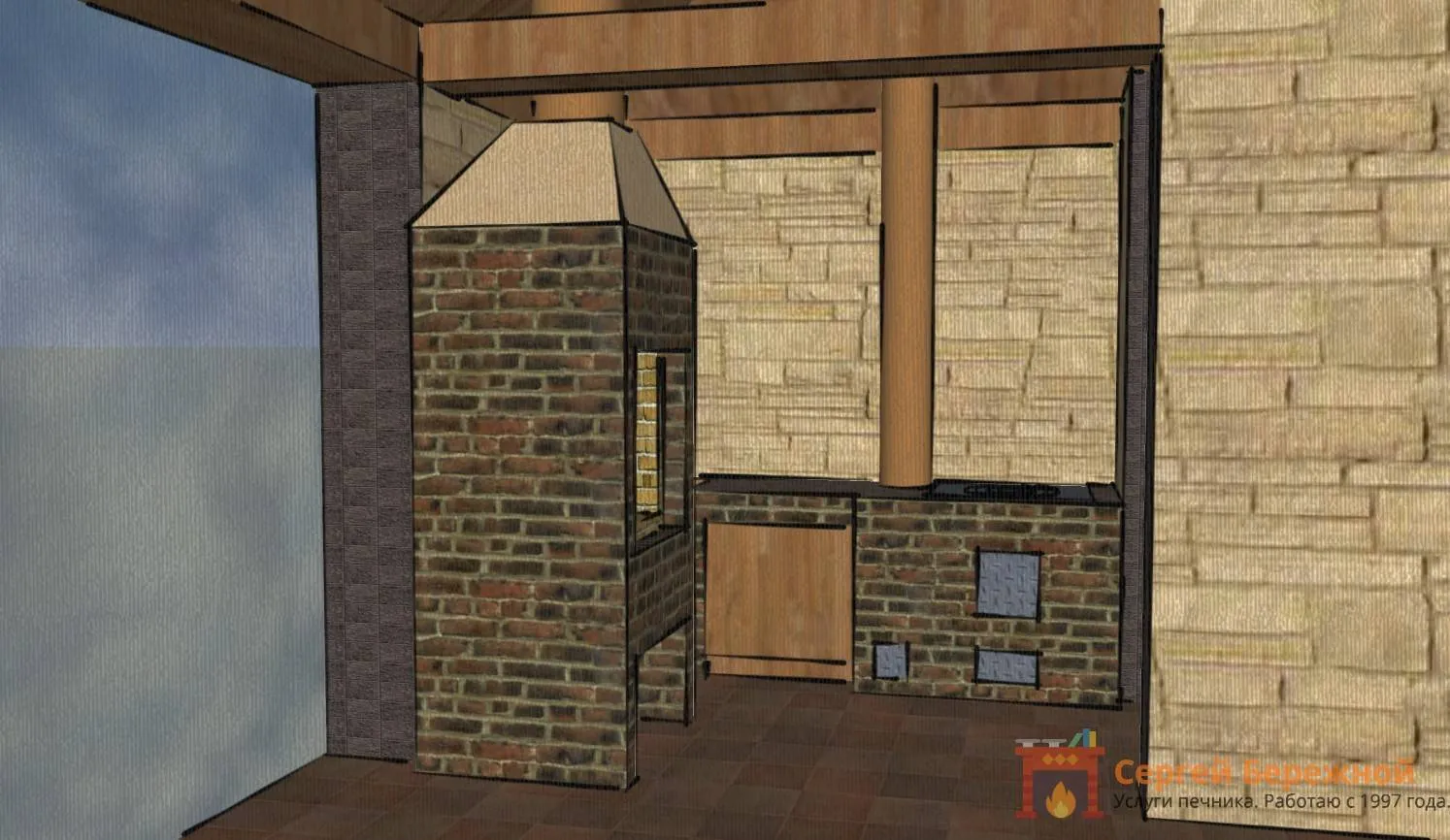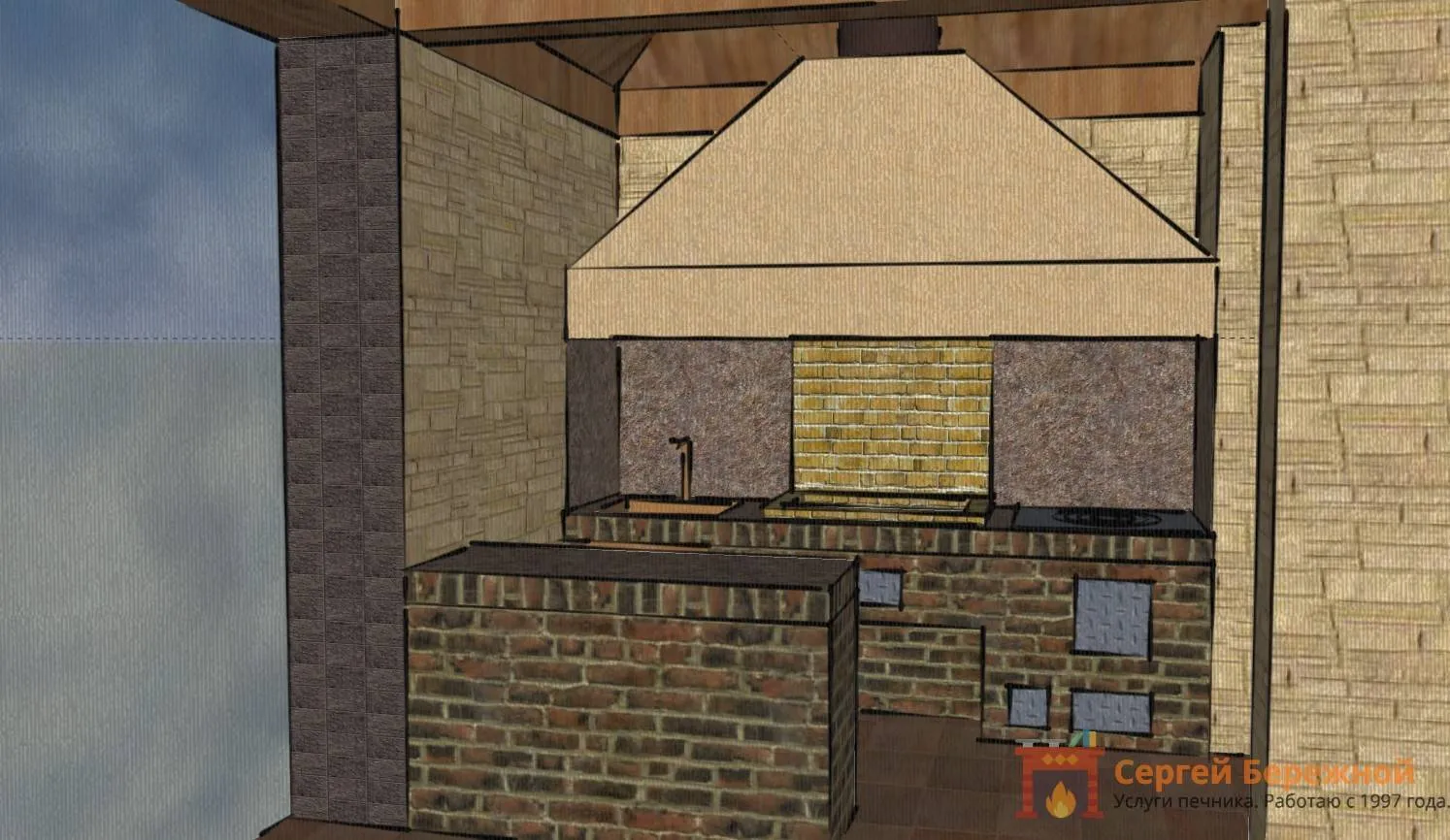Кирпичный комплекс барбекю сделан в небольшом павильоне. На ограниченном пространстве 2*2,5 метра нужно было разместить удобную и функциональную конструкцию, включающую мангал и казан. Сложность проектированию добавляла, проходящая по диагонали, угловая стропила крыши, ограничивающая возможность проведения дымохода.