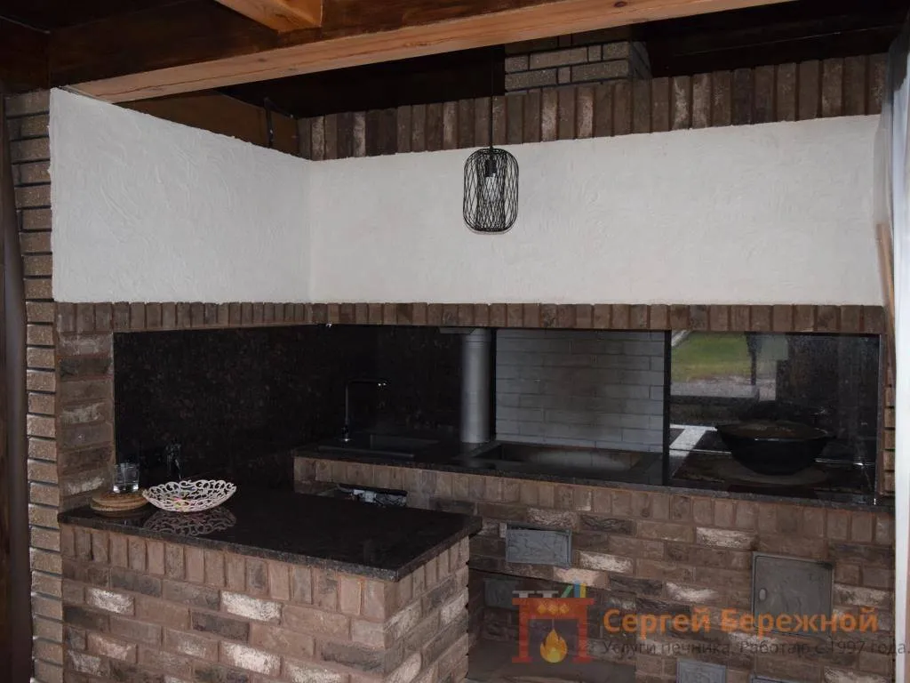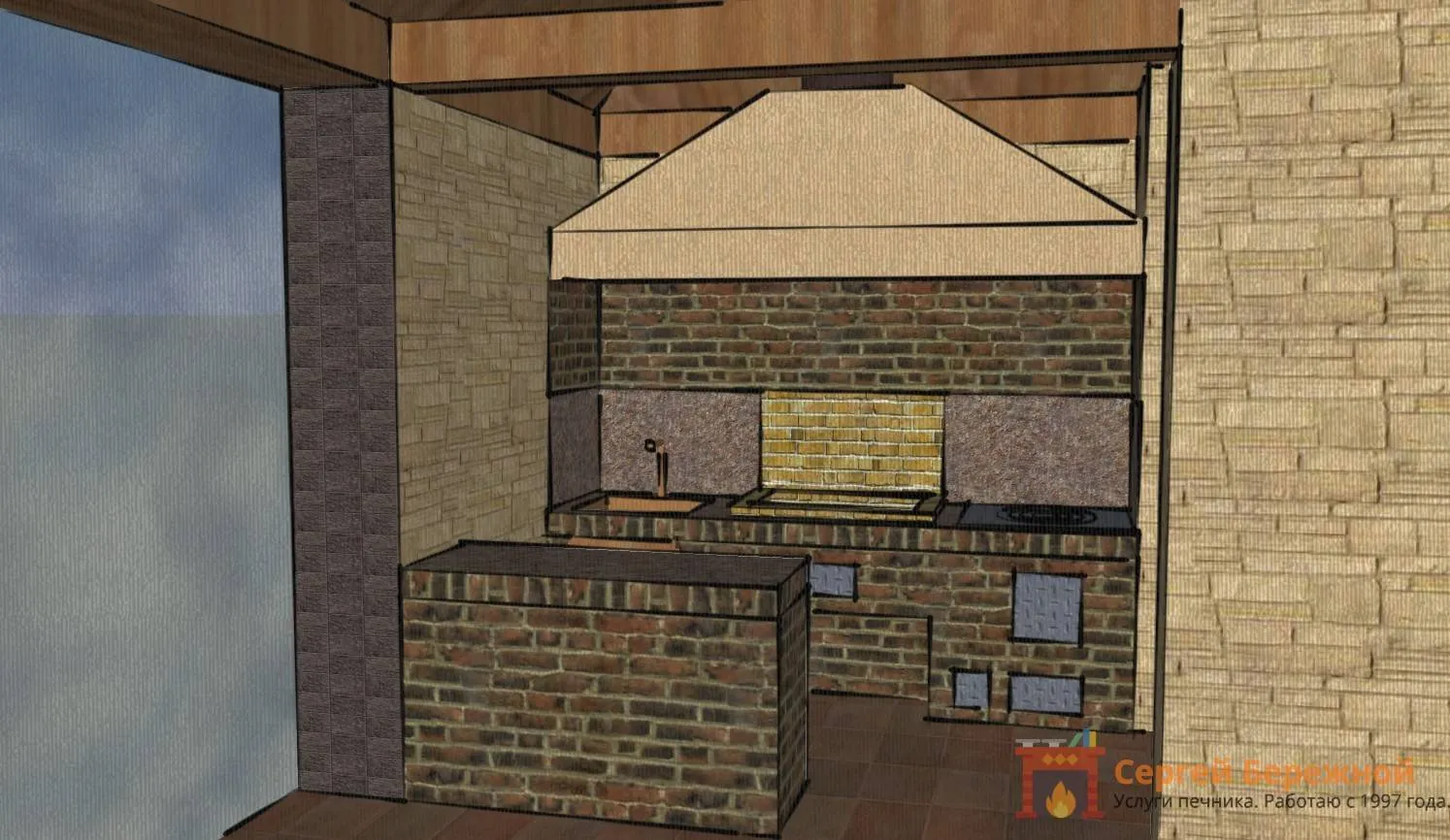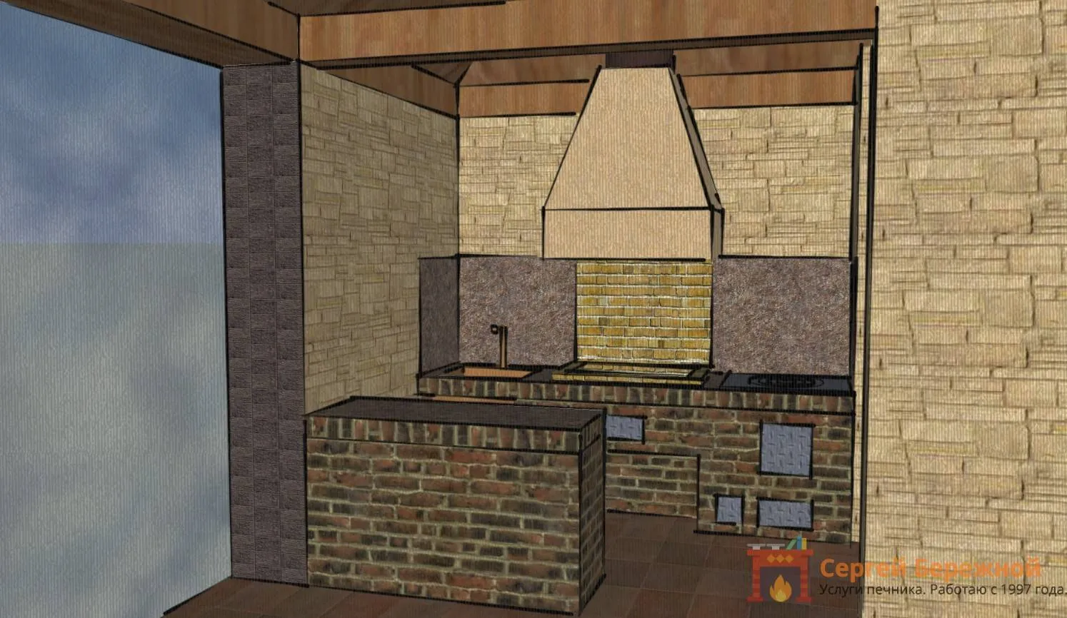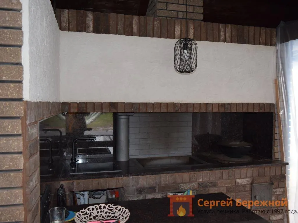 За основу был принят вариант с линейным расположением элементов. Столешница в виде острова, оградила зону комплекса. Верхняя часть, за счет применения фальшь-панелей, объединила в один блок дымосборник мангала, вытяжку над казаном и смонтированный в этой зоне водонагреватель для мойки. Декоративные пояски из плитки, нарезанной из основного кирпича, и гранитный фартук визуально соединили комплекс и столешницу в одно целое. Дополнительная отделка оставшейся части стены в виде грубой мазанки хорошо дополнила зону Барбекю.