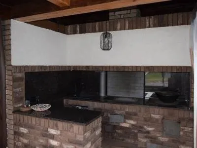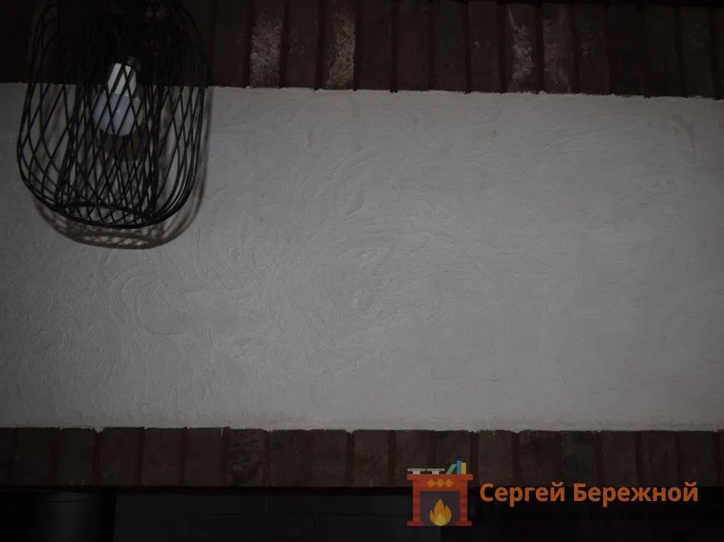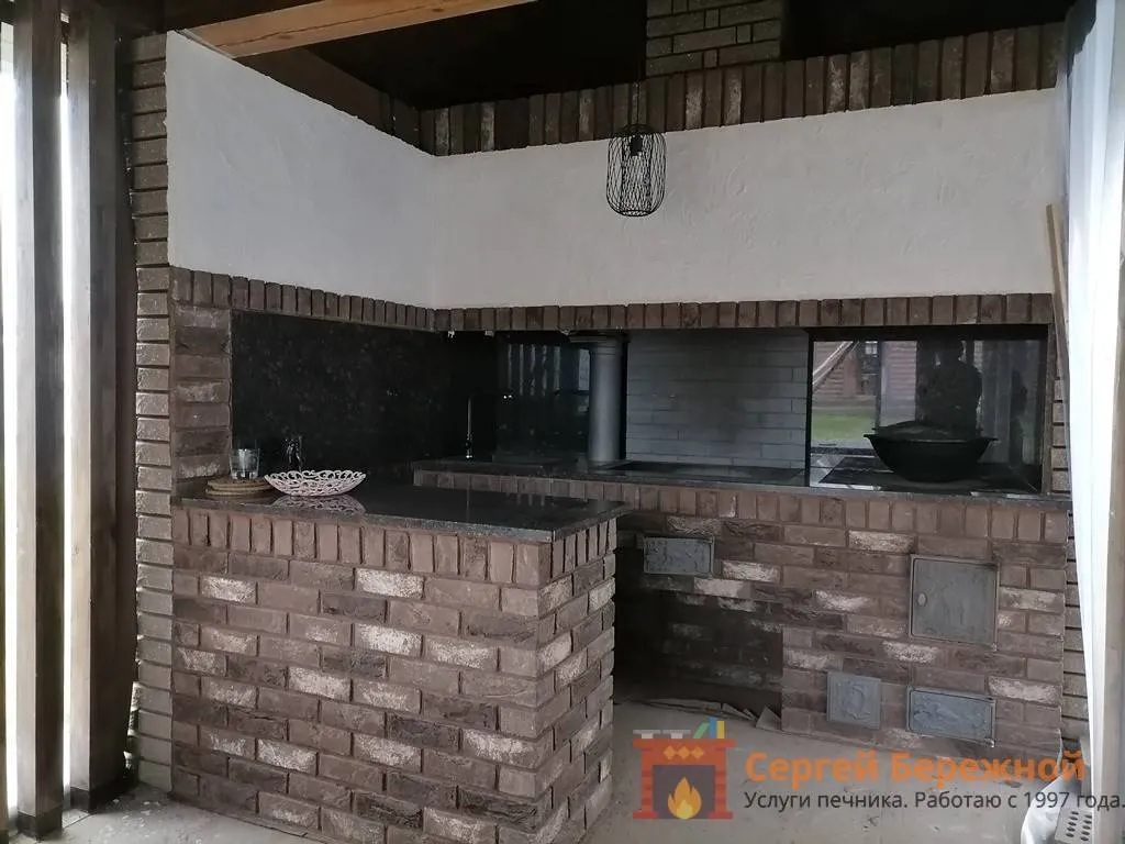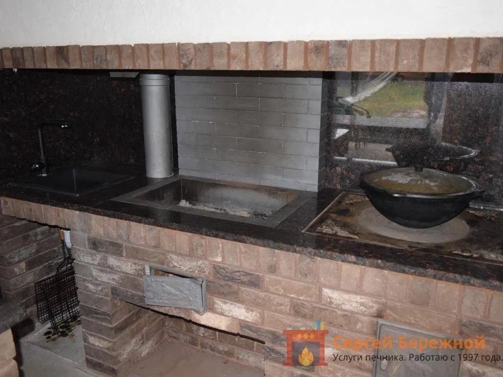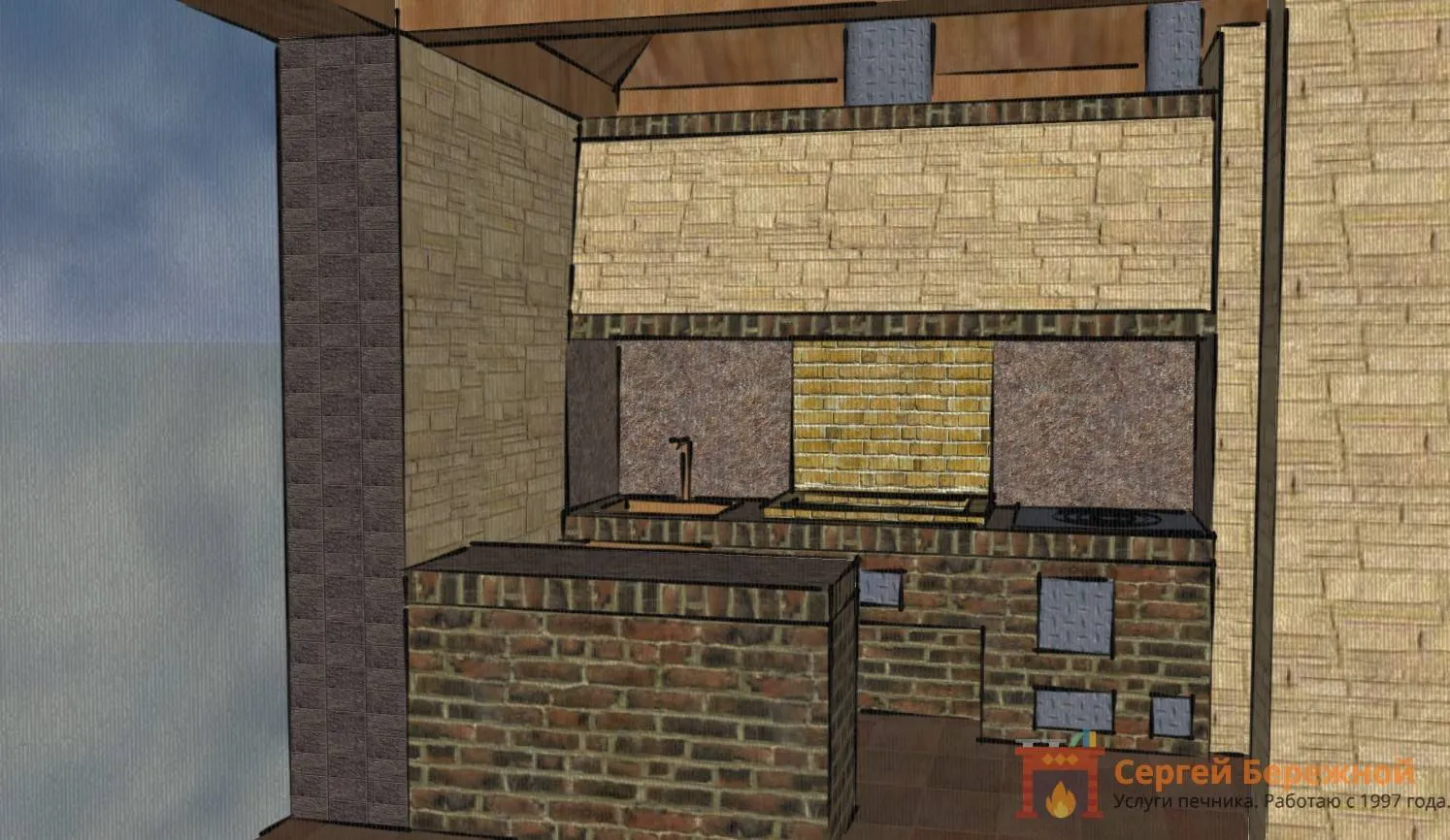 За основу был принят вариант с линейным расположением элементов. Столешница в виде острова, оградила зону комплекса. Верхняя часть, за счет применения фальшь-панелей, объединила в один блок дымосборник мангала, вытяжку над казаном и смонтированный в этой зоне водонагреватель для мойки. Декоративные пояски из плитки, нарезанной из основного кирпича, и гранитный фартук визуально соединили комплекс и столешницу в одно целое. Дополнительная отделка оставшейся части стены в виде грубой мазанки хорошо дополнила зону Барбекю.