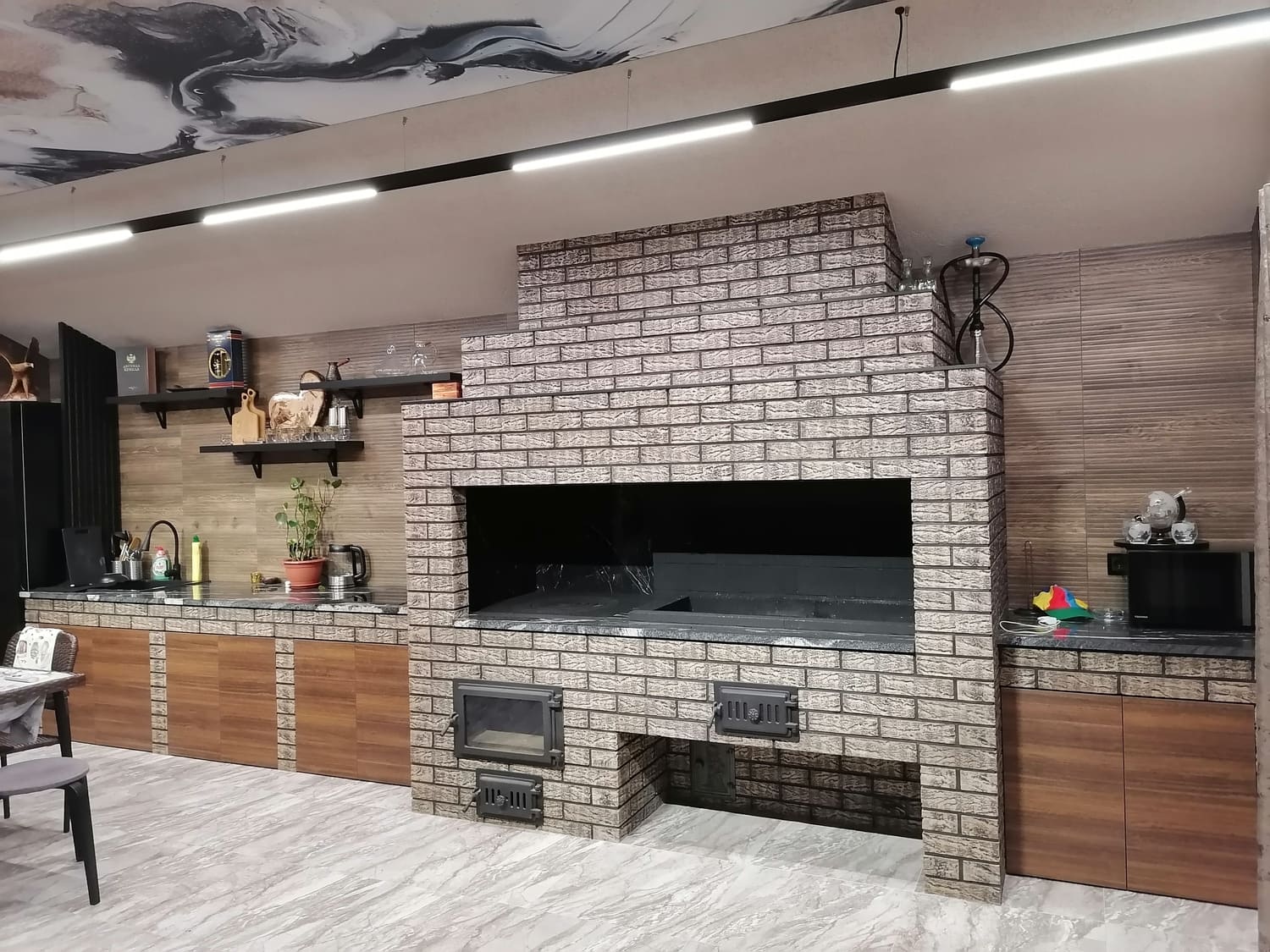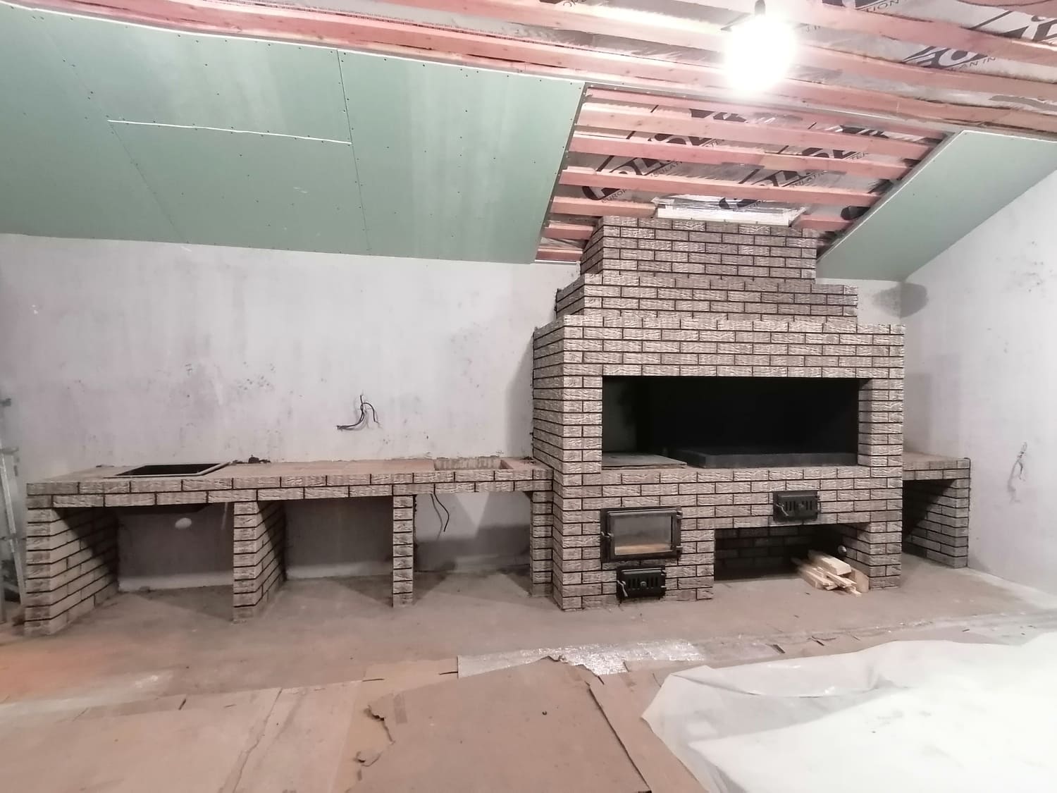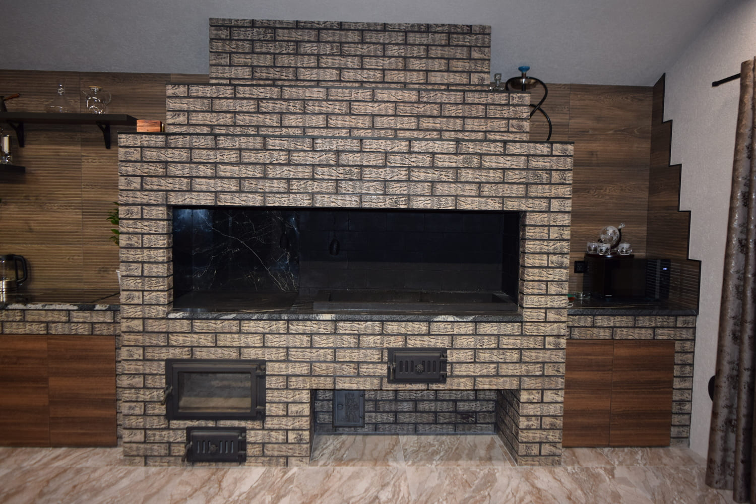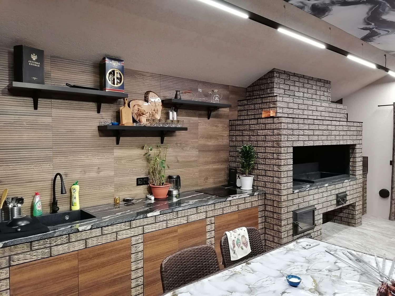 Комплекс барбекю размещается в отдельно стоящем банном комплексе. В качестве основного материала использован лицевой кирпич.