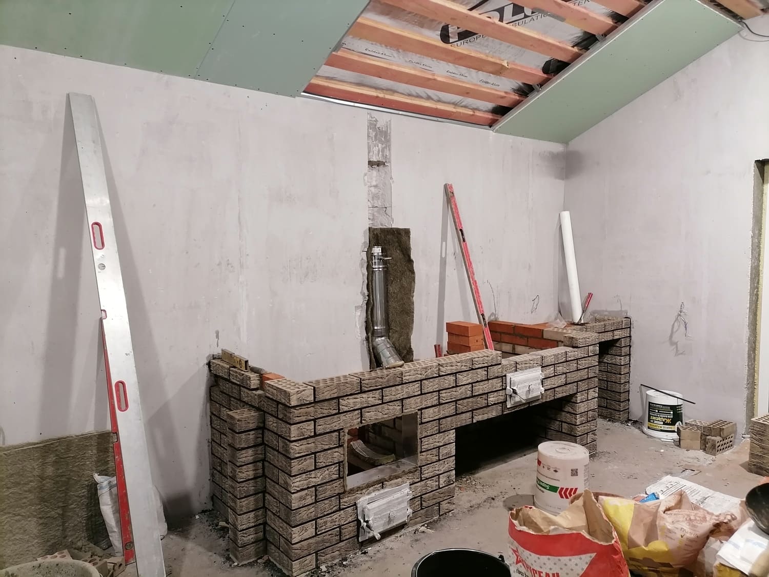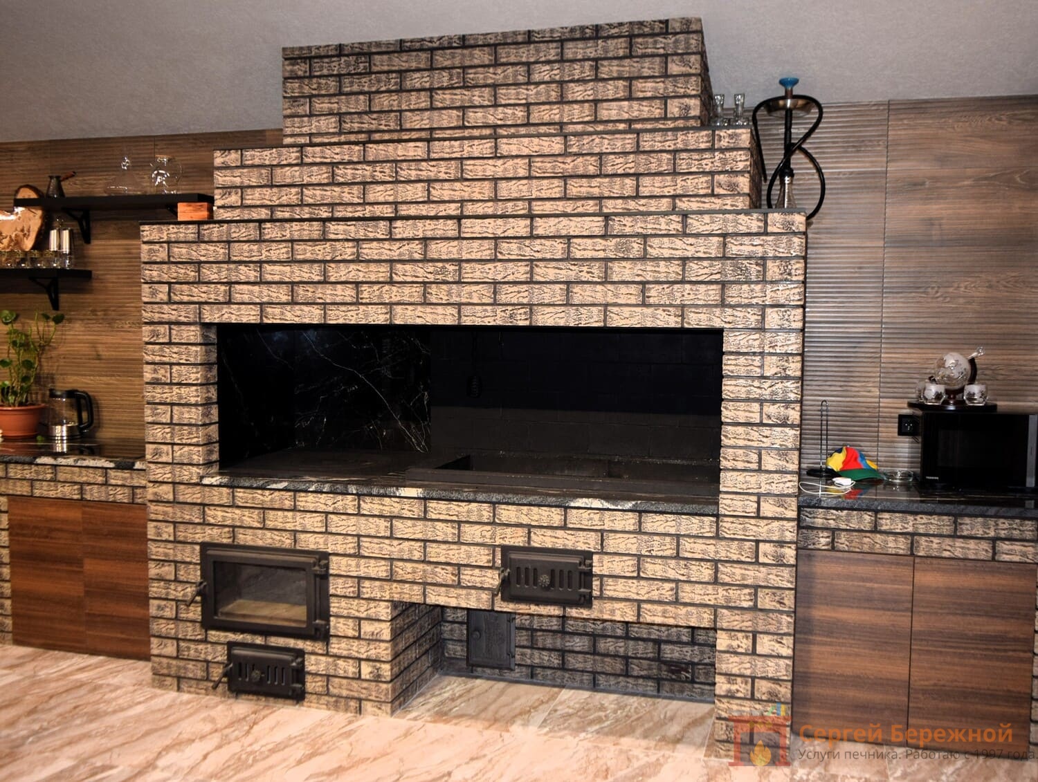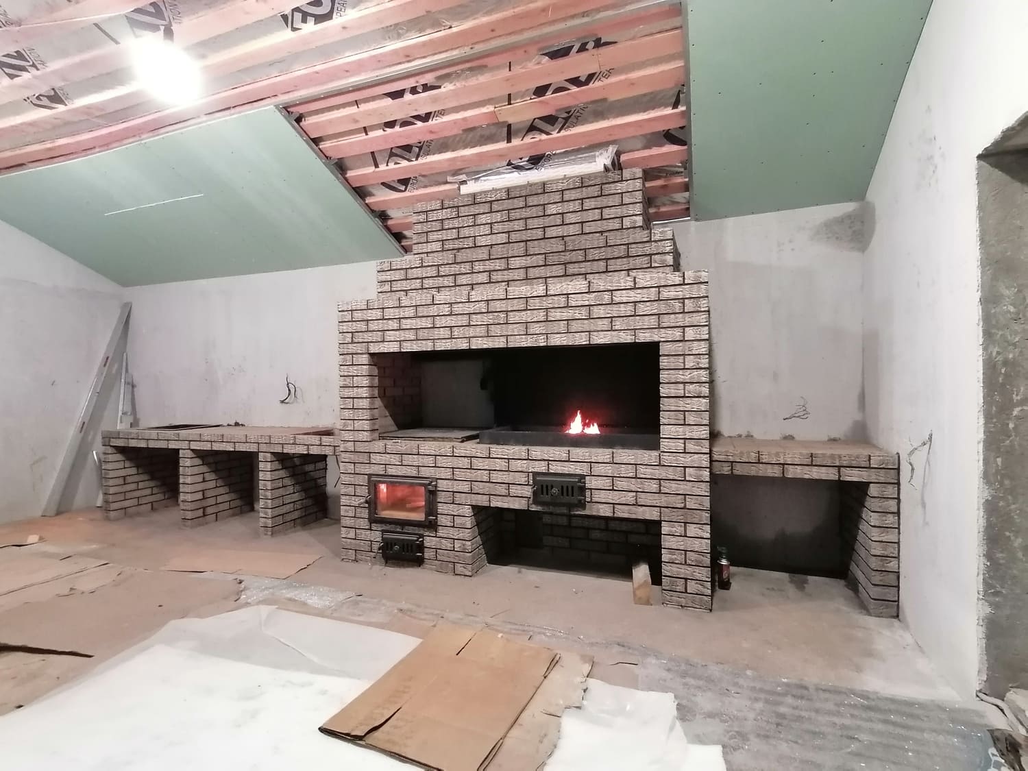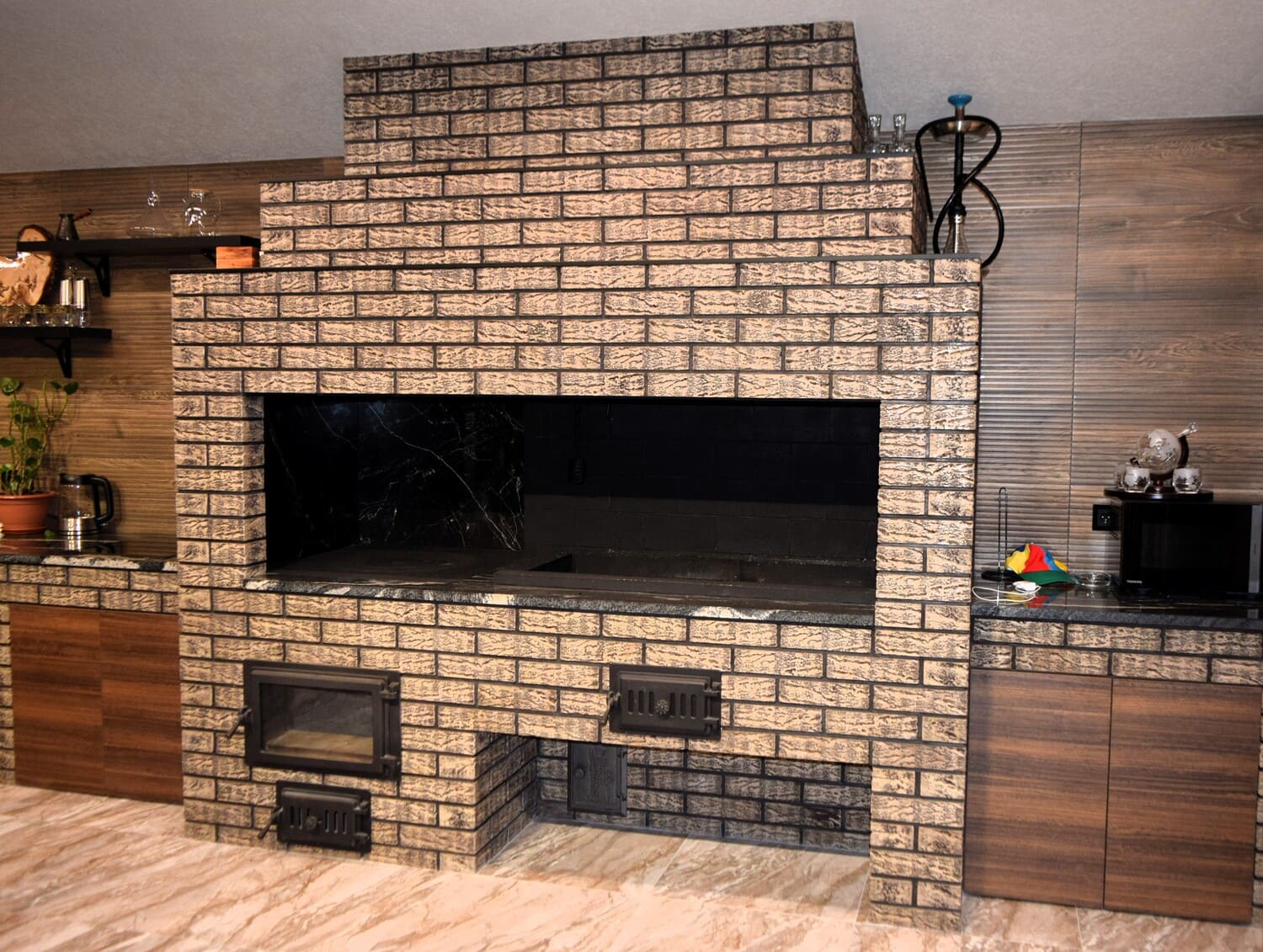 Комплекс барбекю размещается в отдельно стоящем банном комплексе. В качестве основного материала использован лицевой кирпич.