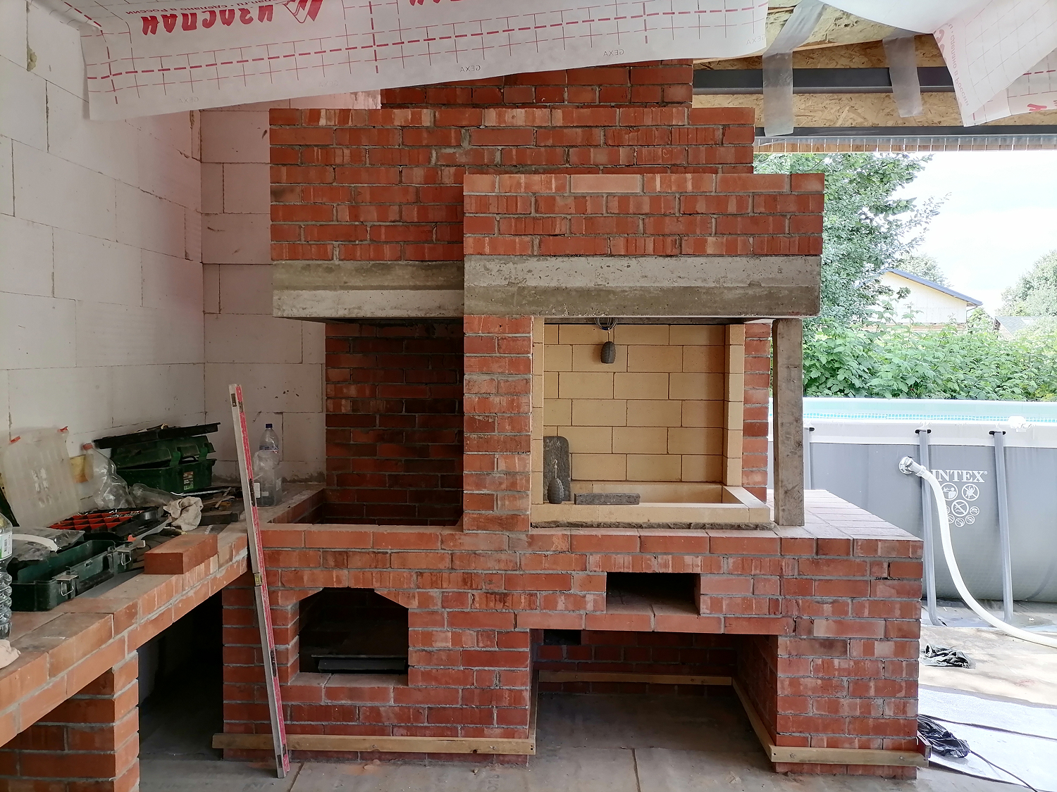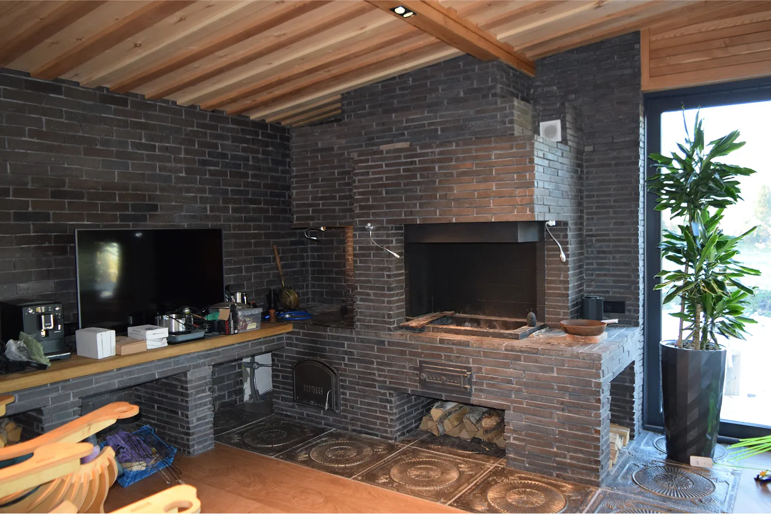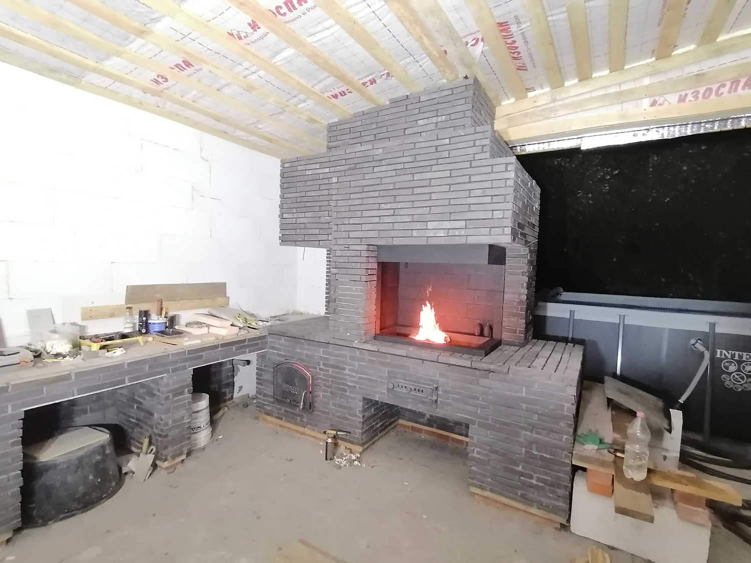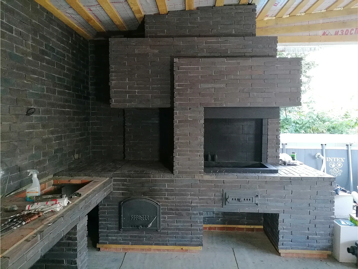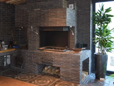 Комплекс барбекю возведён в тёплом помещении, пристроенном к бане.