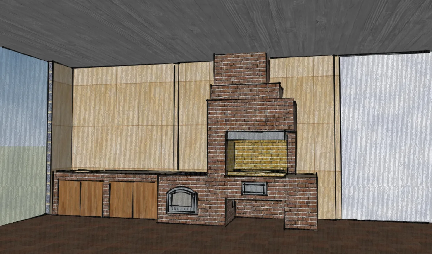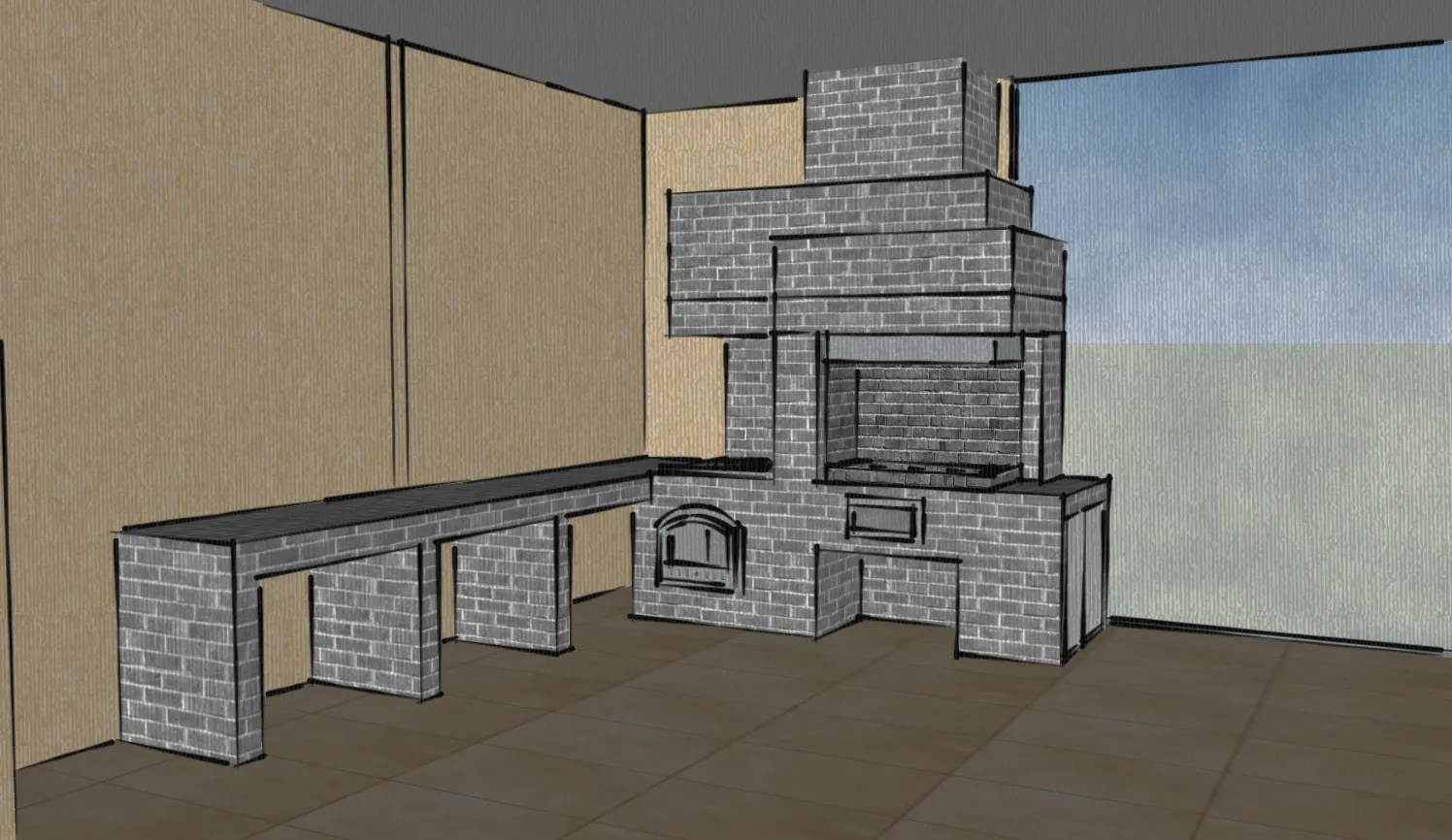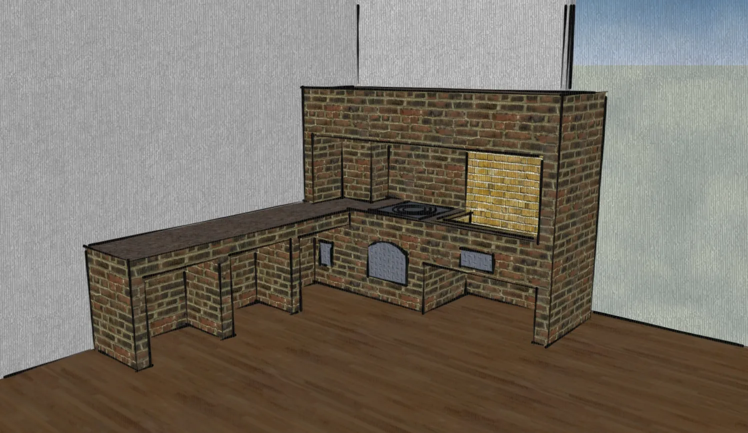 Комплекс барбекю возведён в тёплом помещении, пристроенном к бане.
