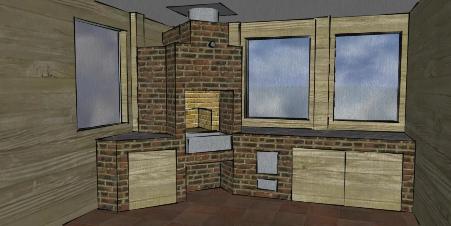 Проект барбекю комплекса угловой с мангалом, казаном, столешницей и мойкой