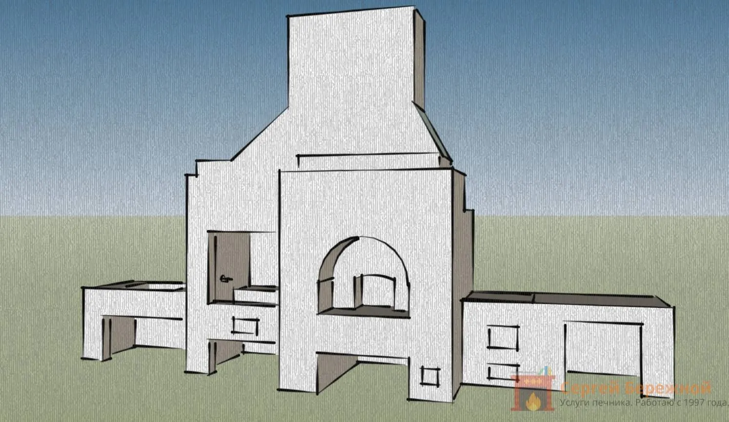 Проект барбекю комплекса прямой с мангалом, казаном, русской печью
