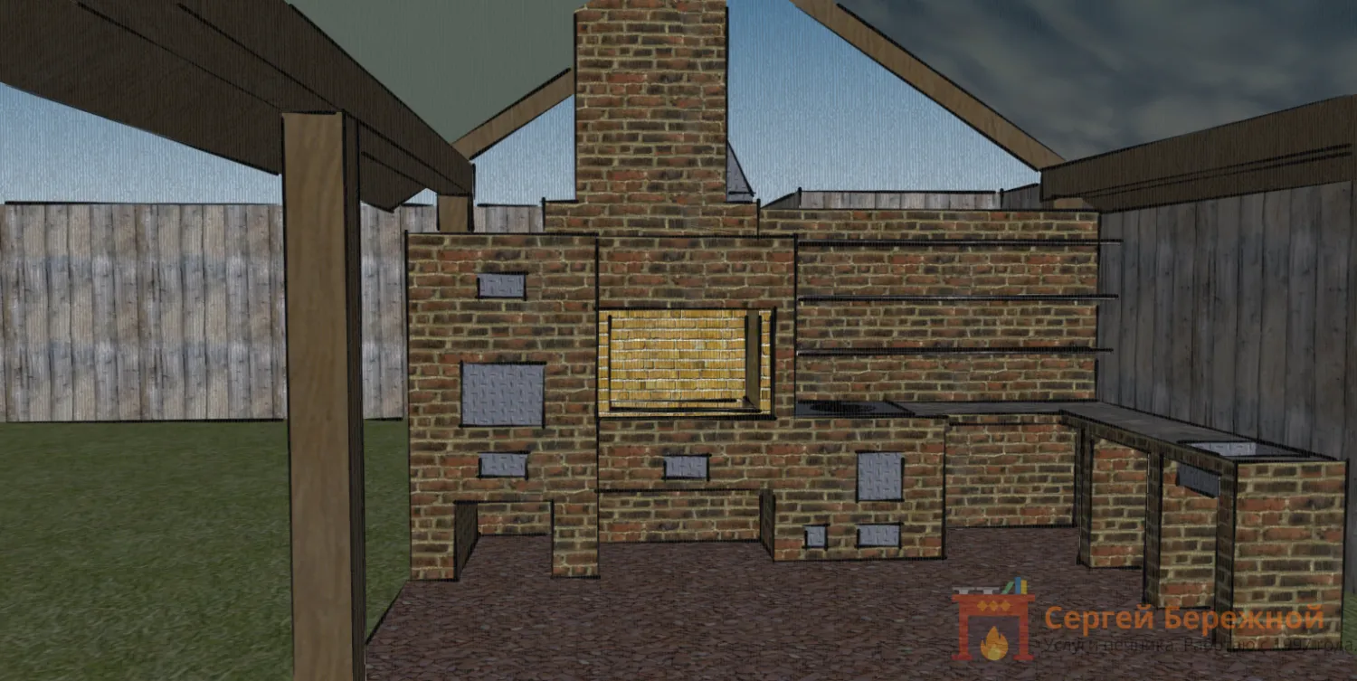 Проект барбекю комплекса прямой с мангалом, казаном, хлебной печью