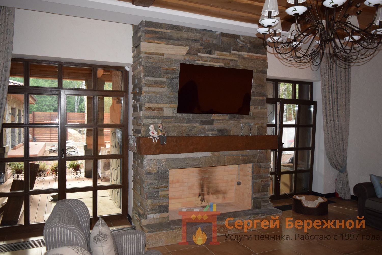 Было выполнено усиление основания. Дымоход выведен через наружную стену здания и в специально организованном коробе поднят на необходимую отметку. Камин работает на естественной тяге. Необходимый объем воздуха подается принудительной приточной вентиляцией.