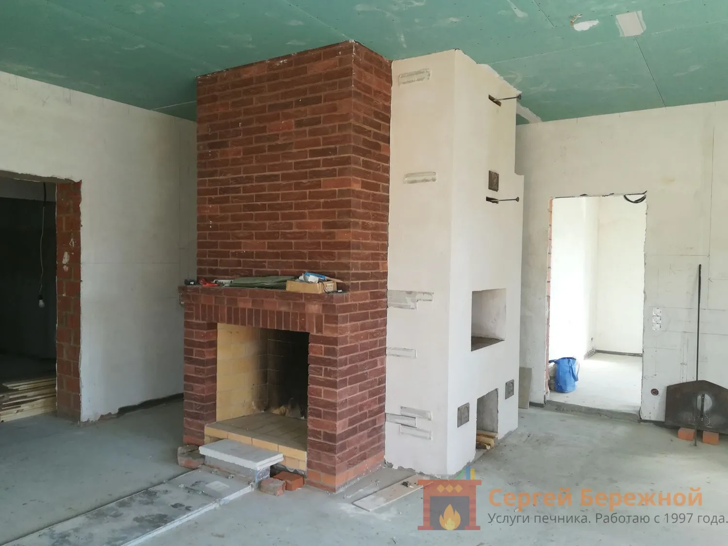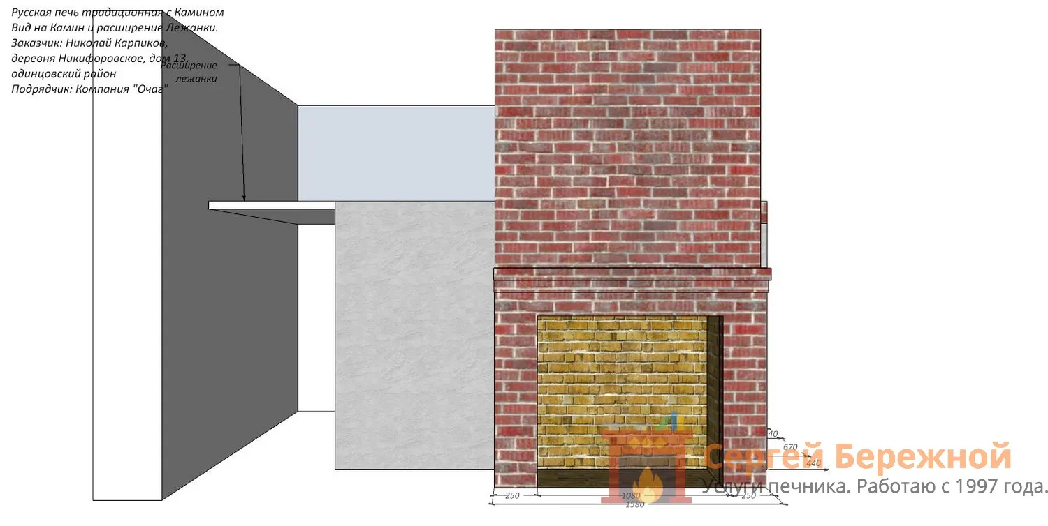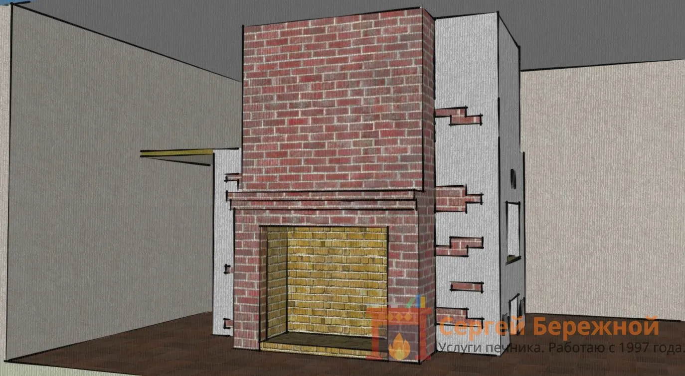 Камин пристроен к боковой стене Русской печи. Для визуального объединение двух конструкций выполнено дополнительное декорирование поверхности печи. Камин имеет свой независимый канал дымоотведения, позволяющий его эксплуатировать независимо от печи. С задней стороны камины выполнен сложный узел смещения дымохода к основному стояку.