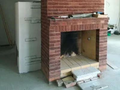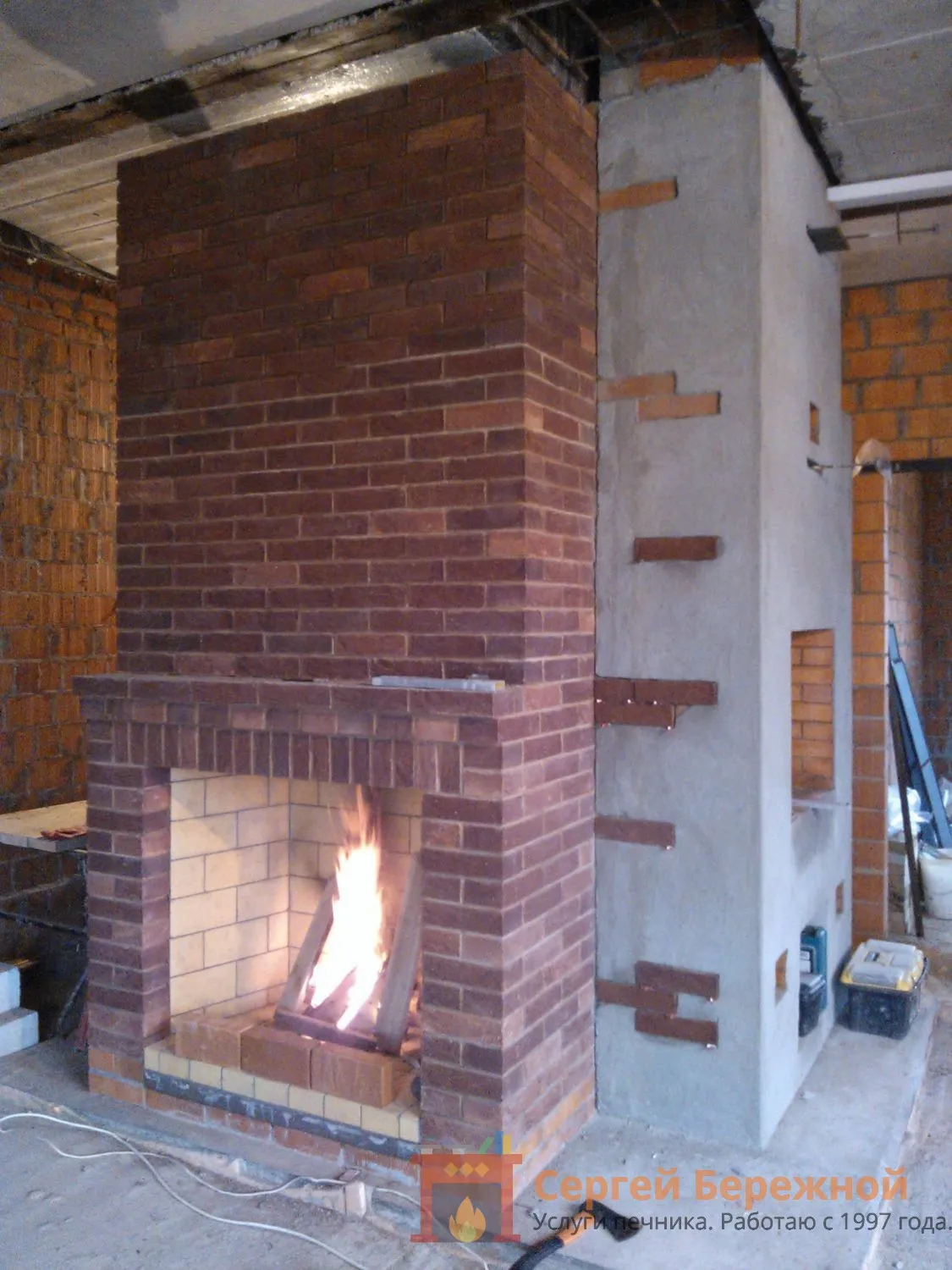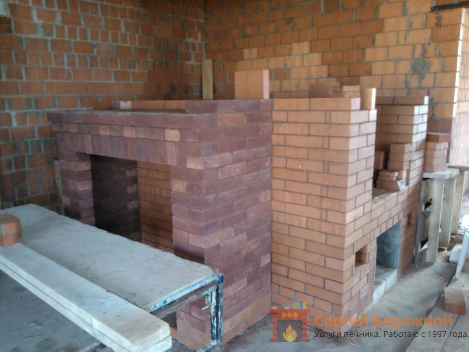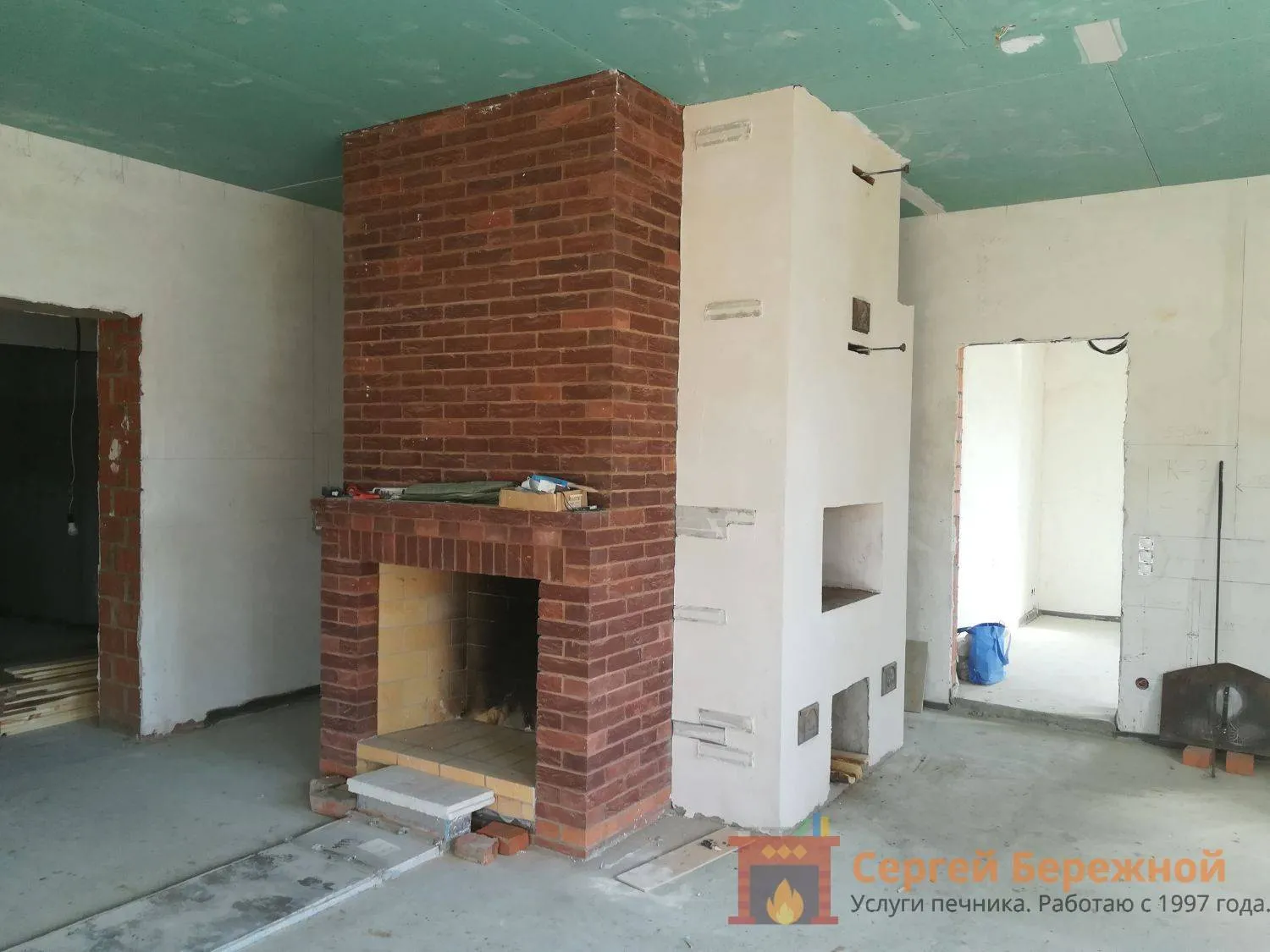 Камин пристроен к боковой стене Русской печи. Для визуального объединение двух конструкций выполнено дополнительное декорирование поверхности печи. Камин имеет свой независимый канал дымоотведения, позволяющий его эксплуатировать независимо от печи. С задней стороны камины выполнен сложный узел смещения дымохода к основному стояку.