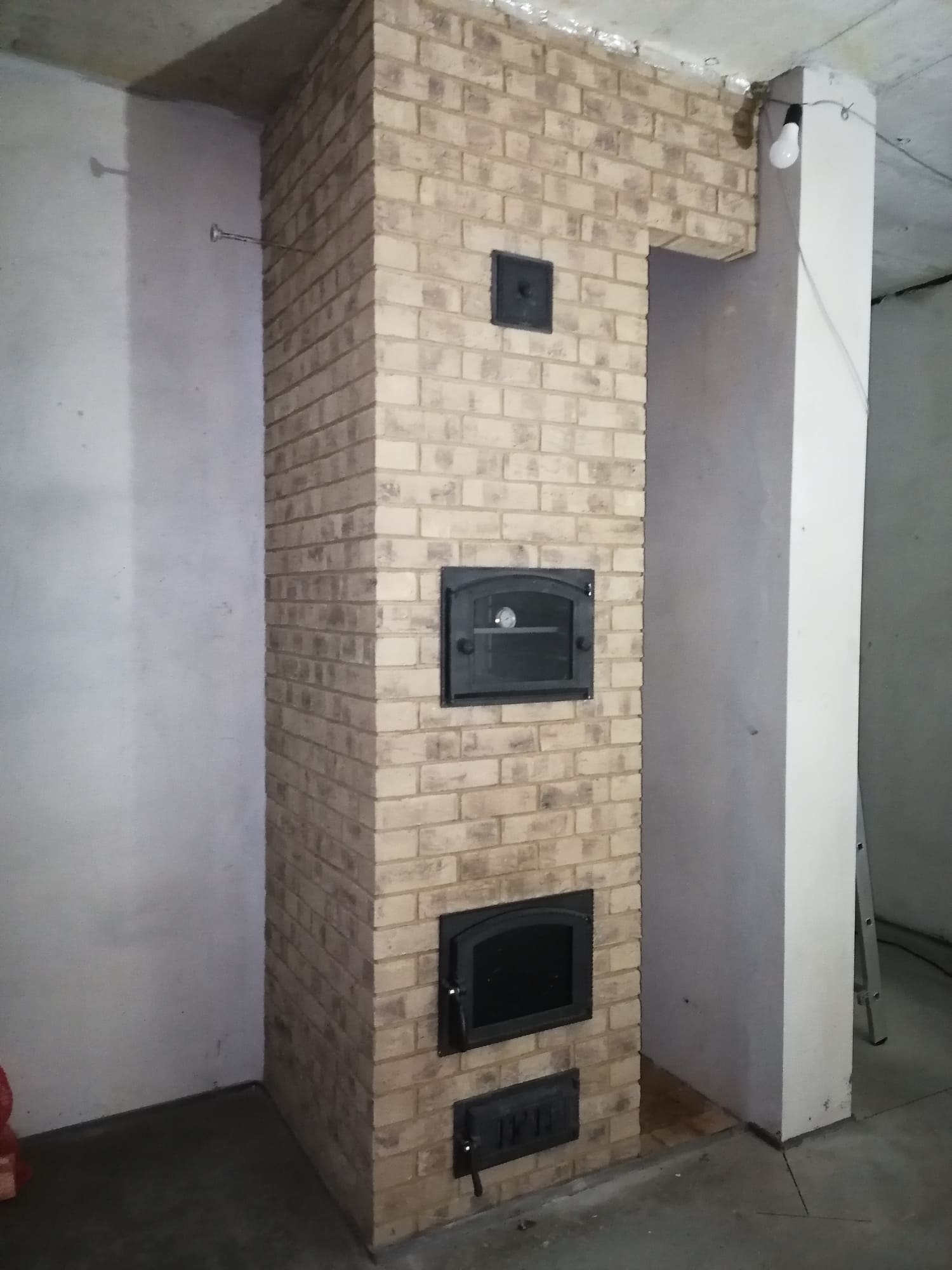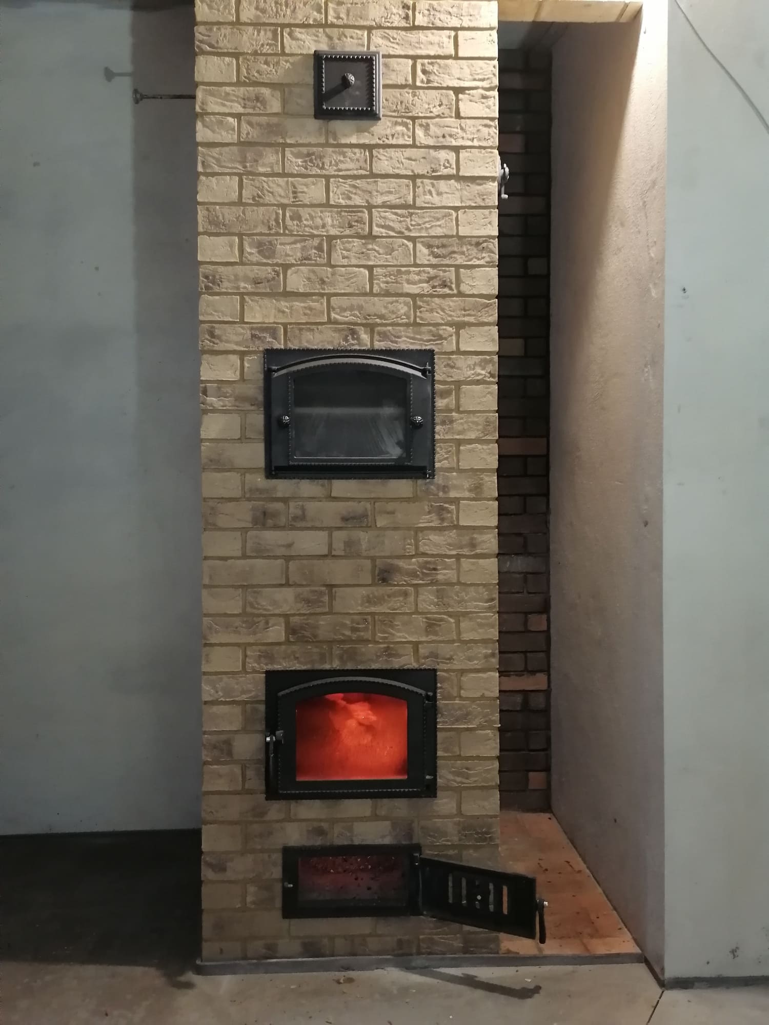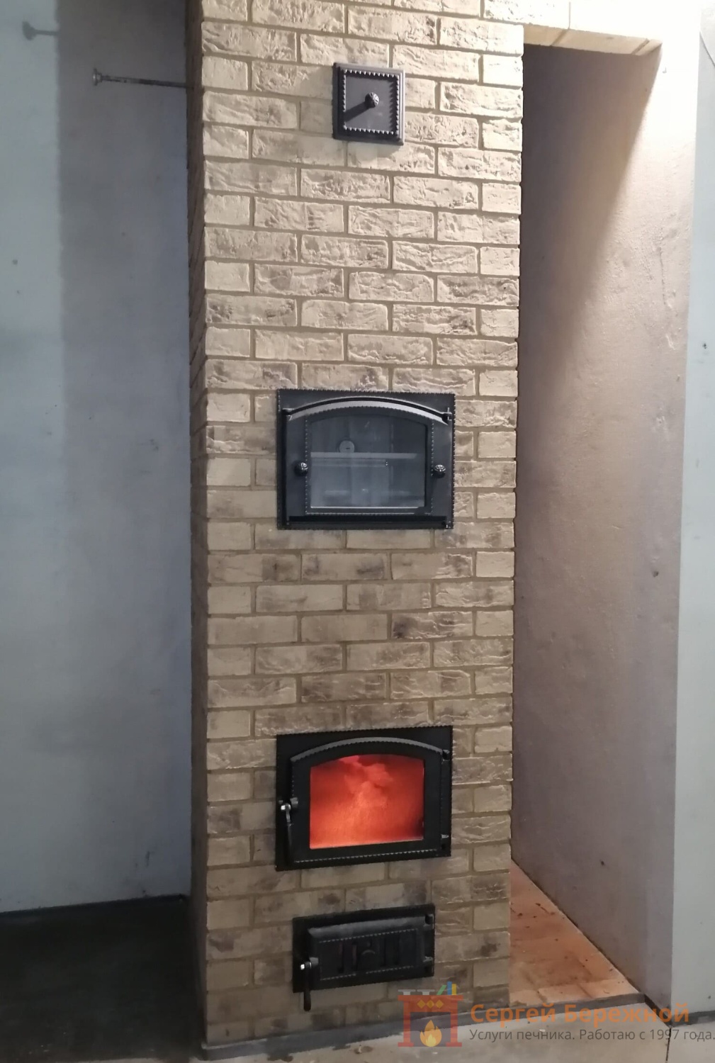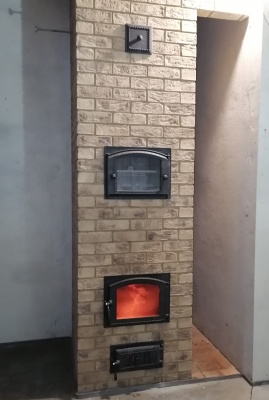 Печь выложена в помещении кухни-гостиной. Имеет декоративный характер, но из-за размеров кирпича очень быстро прогревается. Наличие духовки позволяет готовить и разогревать пищу.
