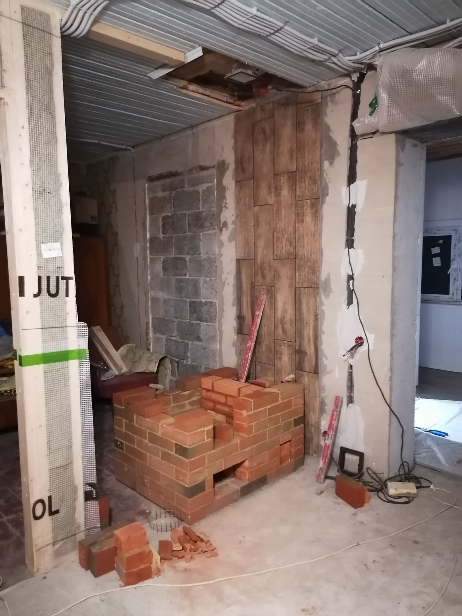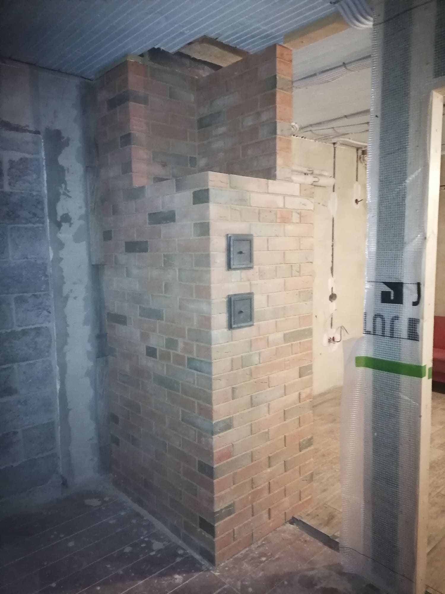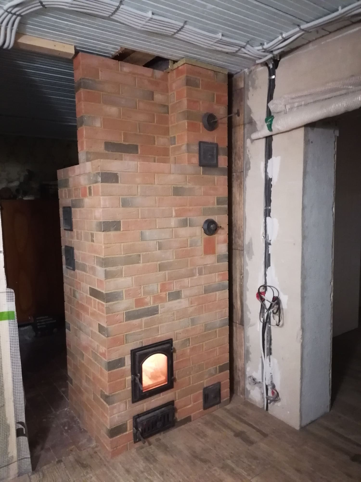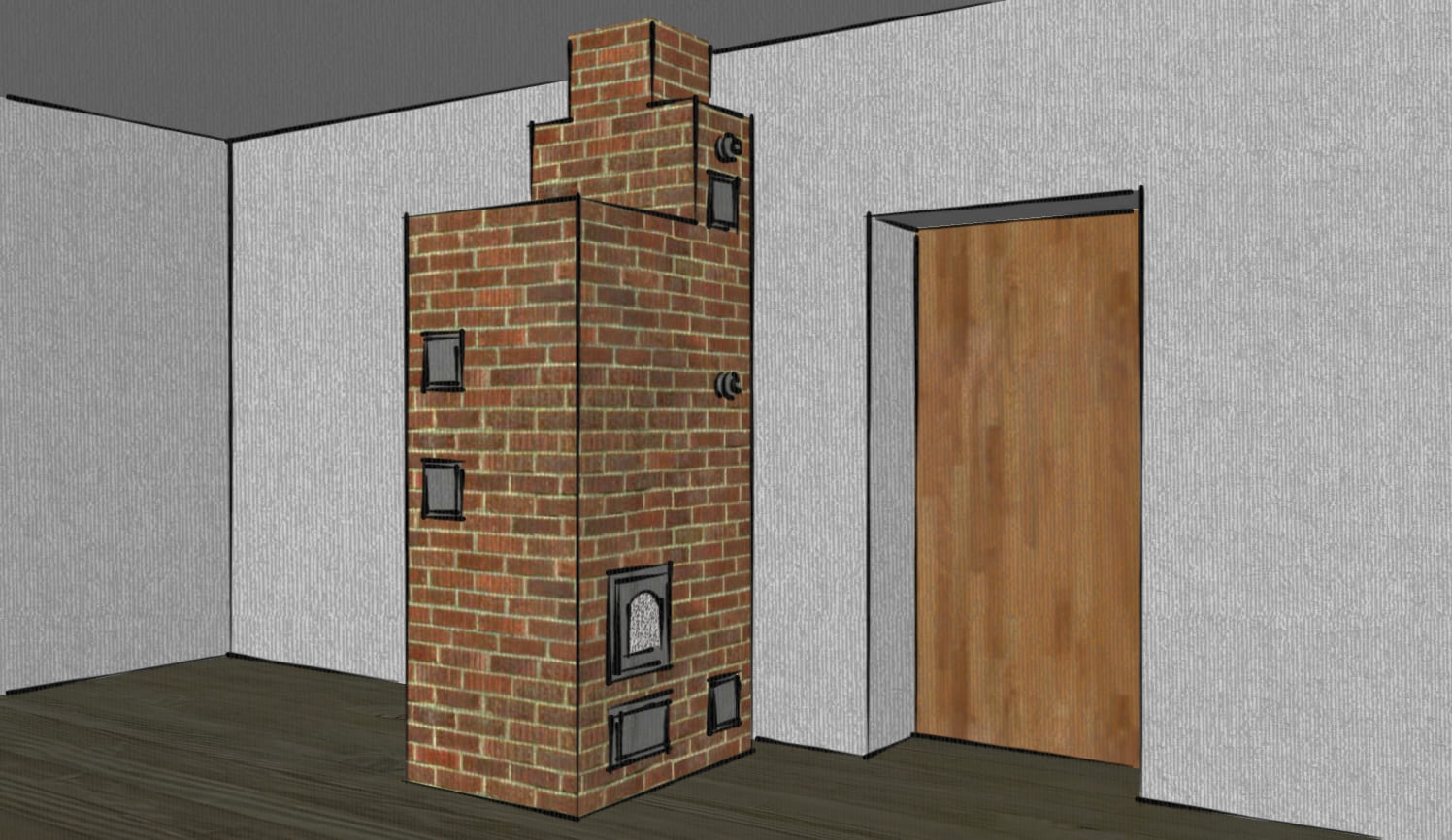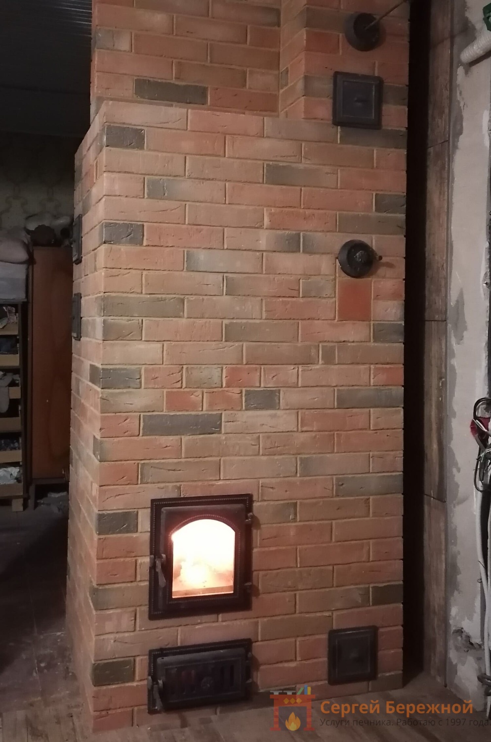 В небольшом доме проводились работы по реконструкции здания. После осмотра имеющейся печи был рекомендован демонтаж и строительство новой конструкции. Размеры, форма и вес печи не должны были превышать прежних значений. В доме появилась современная кухня и от печи требовался эстетичный внешний вид, пожаробезопасность и эффективная теплоотдача. В качестве наружного слоя был принят лицевой полнотелый кирпич повышенной плотности с фактурной поверхностью и эффектом пестрой кладки. Так как в доме не планируется постоянное проживание в конструкции предусмотрен облегченный запуск и равномерность прогрева всех стенок.