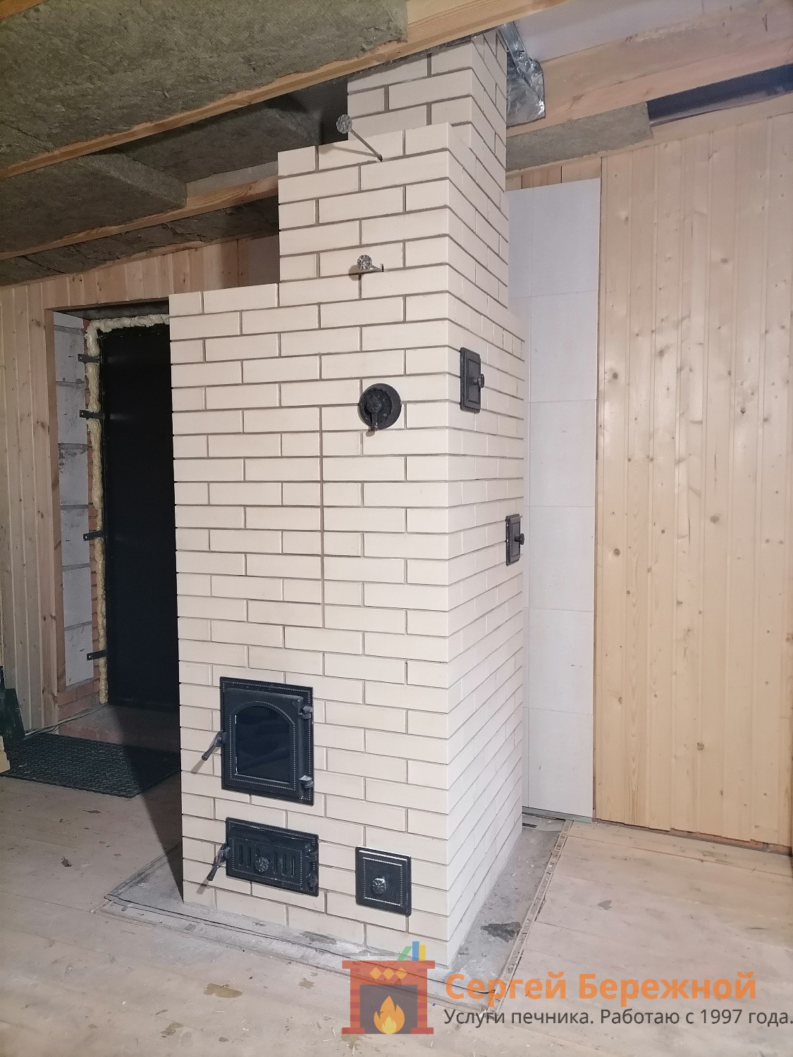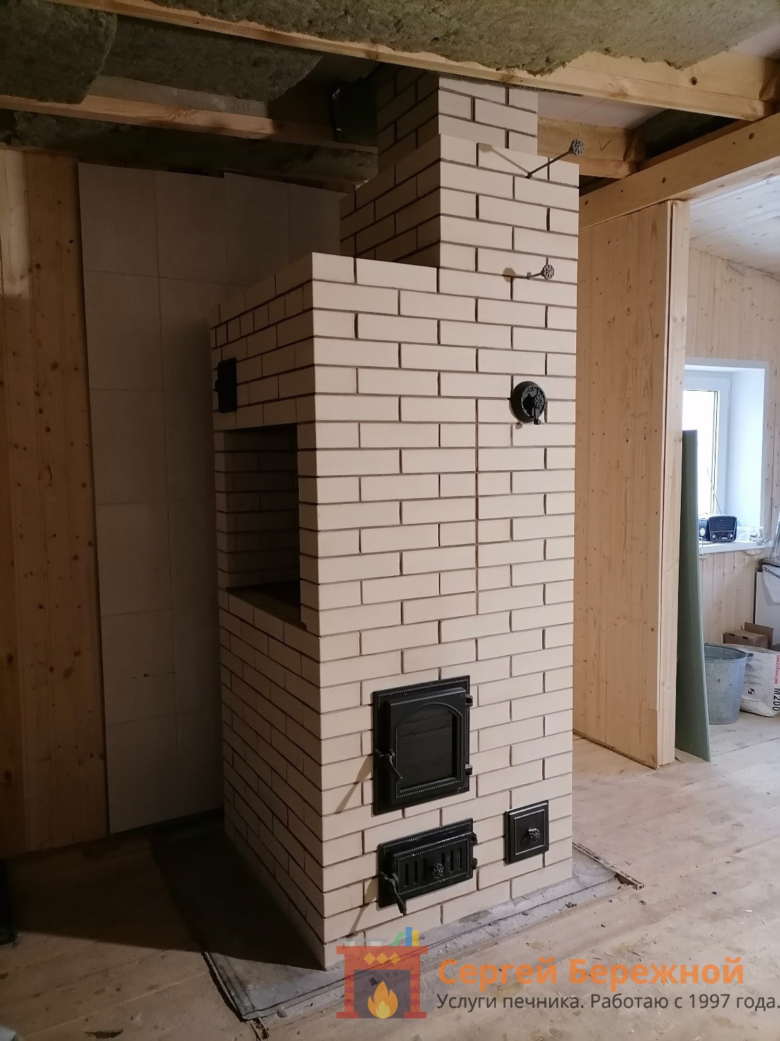 Была задача сделать конструкцию в светлом кирпиче. Пременена продукция питерского завода “Победа ЛСР”. Кирпич очень плотный, тяжелый. Быстро прогревается и долго держит тепло.